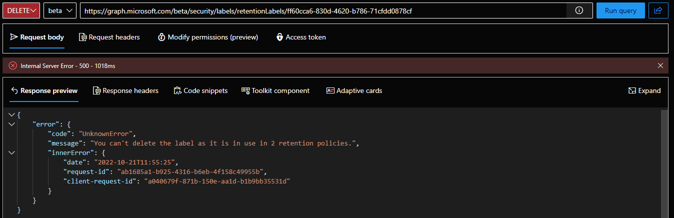 To cover the remaining retention labels events, we can also modify existing labels (PATCH request) or remove them when they are no longer needed (DELETE request). Same old rules apply to both operations, i.e. most retention label properties cannot be modified post creation. Similarly, you cannot delete a label that has been published to one or more retention policies or is auto-applied. And since we don’t currently have access to the corresponding policies endpoints, at this time you cannot “unpublish” a label and can only run the delete operation against newly created or “unused” retention labels.