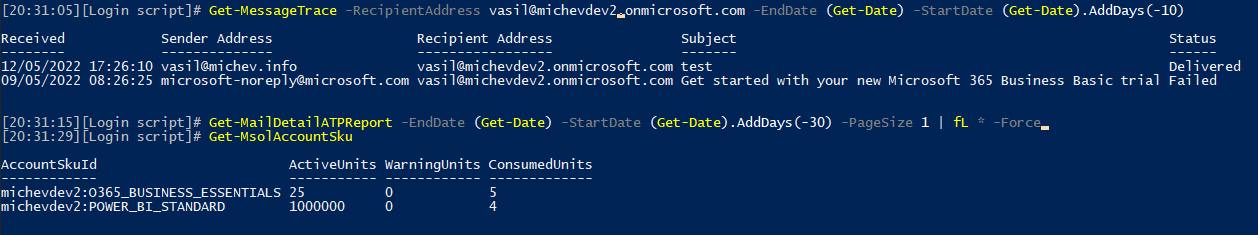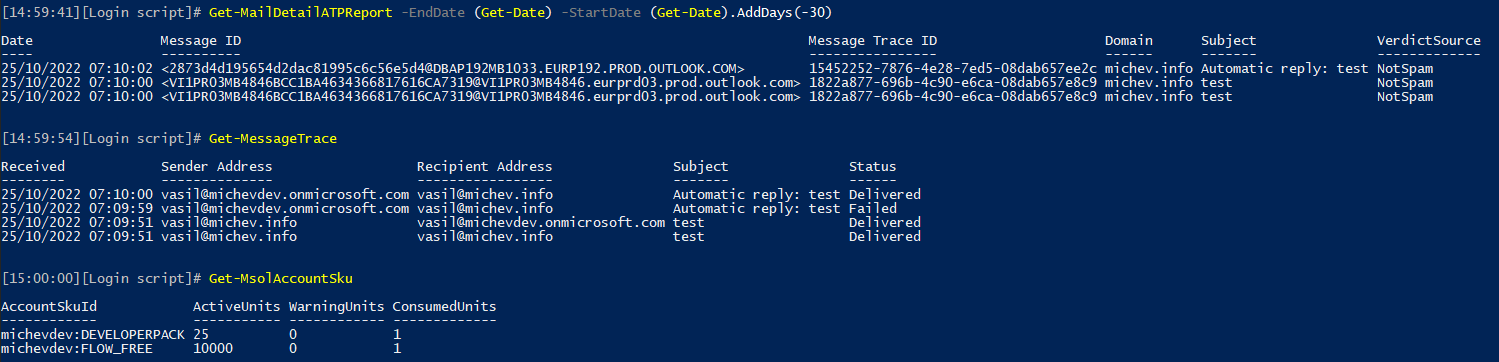Here are some illustrations on how the cmdlet works now, across various tenant configurations. The first screenshot below shows the result in a Office 365 E3 Developer tenant, whereas the second one is from an Microsoft 365 Kiosk one (actually the same tenant that I used to illustrate the issue, but the trial SKUs therein expired and I replaced them with new trial). Both tenants do not have a Defender for Office 365 service plan/SKU included, but the cmdlet does return a set of results matching the output of Get-MessageTrace.