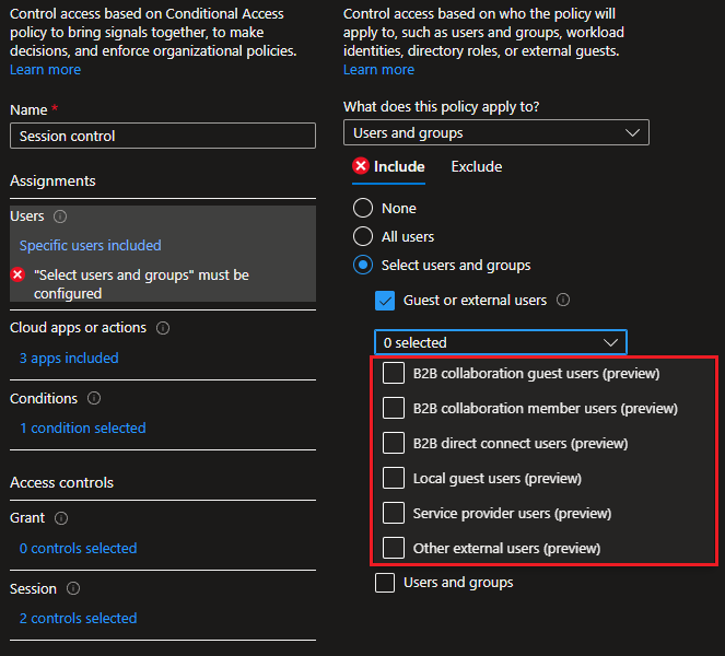 As part of a new preview functionality, Microsoft is introducing an expanded set of controls for Conditional access policies, revolving around granularly including/excluding specific guest users. You will find the new controls as part of the Users and groups > Select users and groups > Guest or external users selection. Therein, you can choose from six types of Guest or external users categories, as follows: