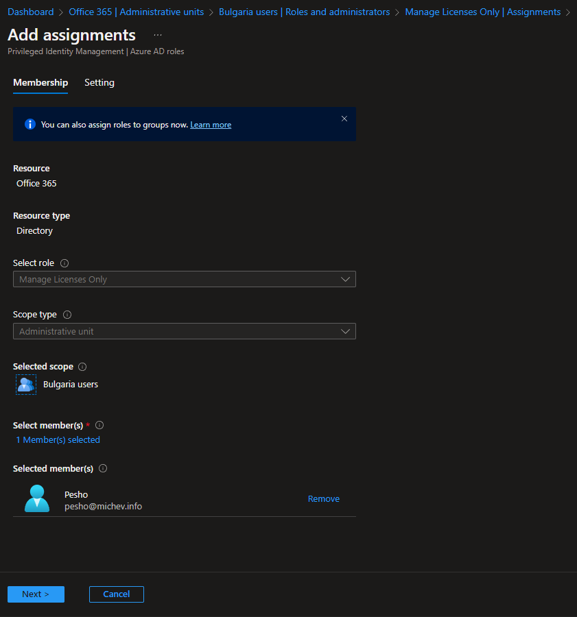 As an example, let’s assign our Manage Licenses Only custom role to a given user, and make sure he can only use his newly assigned privileges against users in a given AU, for example the Bulgaria users AU. To create the role assignment, go to the Azure AD blade > Administrative units > select the AU in question > Roles and administrators. Here, you should see a list of all (built-in and custom-created) Azure AD roles that support an AU-scoped role assignment. Clock on the Manage Licenses Only entry, then hit the Add assignments button. The only thing left to configure is the set of user(s) to which the role assignment will be linked to, which you can do by hitting the Select Members link. As in my case the tenant is using Privileged Identity Management, I will also have to select the assignment type and duration. Once you hit the Assign button, the relevant user(s) will be able to enjoy their newly assigned privileges, after obtaining a fresh access token that is.