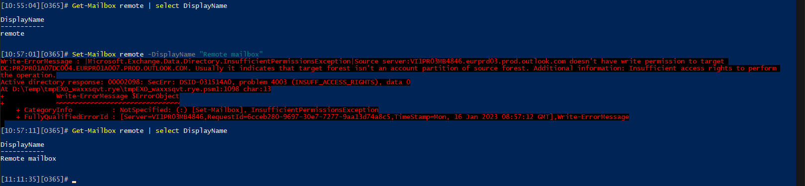 Look closely. We start with an Exchange Online object and check its DisplayName value. We then try to modify said value via the Set-Mailbox cmdlet. We again get an error message, in fact the exact same message we got when we tried to modify an Exchange-only property. But here’s where it gets wild – if you check the same attribute’s value a minute later, it’s now changed!?!