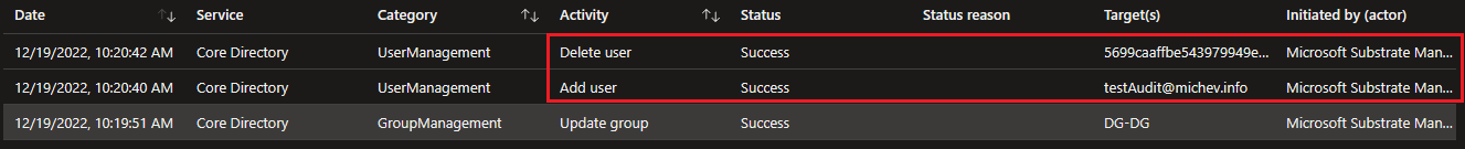 On Azure AD’s side however, we do get some events. This confirms that Azure AD was indeed the perpetrator in this case, and is responsible for the change being actually committed.
