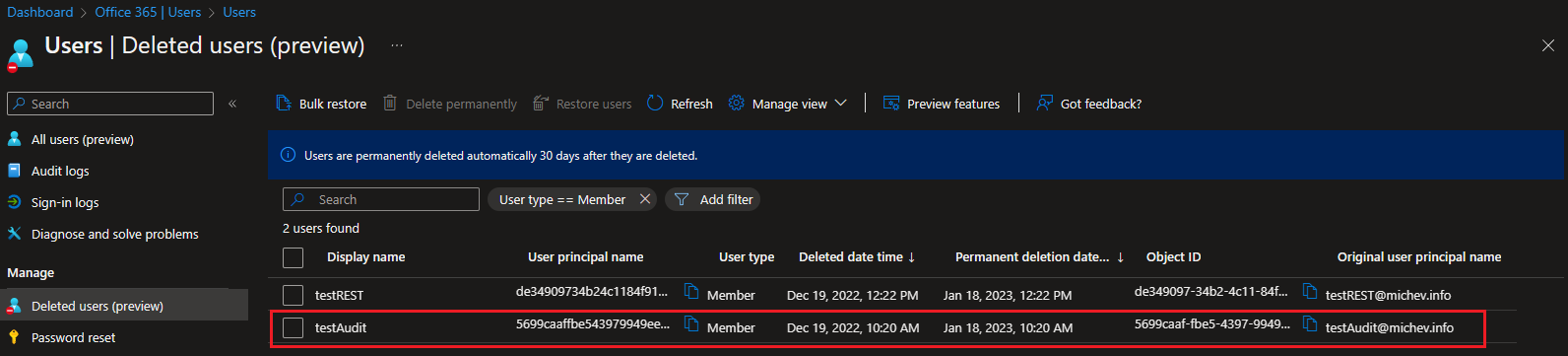 As further evidence, the now deleted user object can be found in the Azure AD recycle bin: