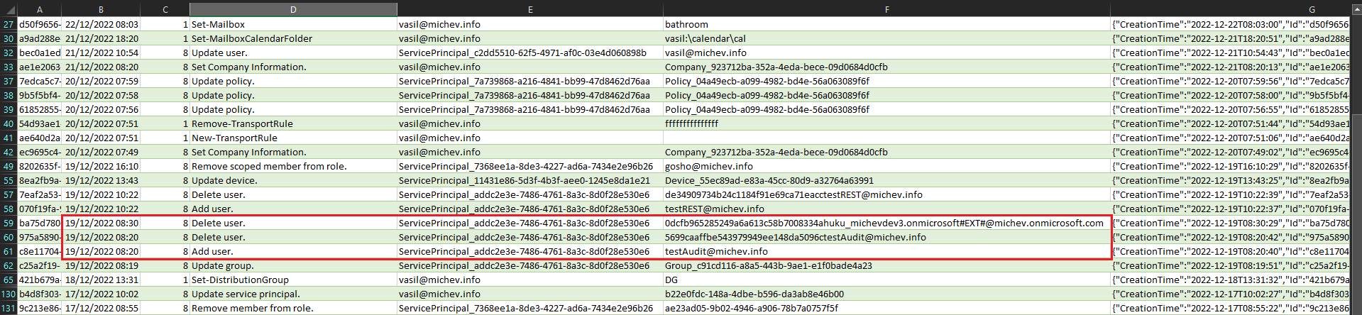 We already illustrated what the audit logs look like for non-destructive cmdlets. More interesting examples used the New-Mailbox and Remove-MailUser cmdlets, which as mentioned above were run in a different tenant in an attempt to illustrate the issue can easily be reproduced. So let’s look at what audit trail exists within said tenant. Below is a screenshot of the exported Unified audit log trail, combining events from Exchange Online (RecordType 1) and Azure AD (RecordType 8), with timeframe covering few additional days to account for any “straggler” entries. Note that “system” events are excluded.
