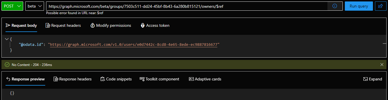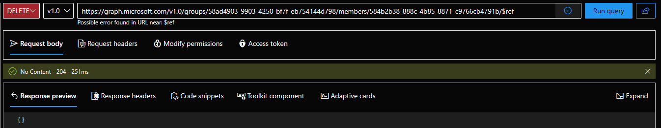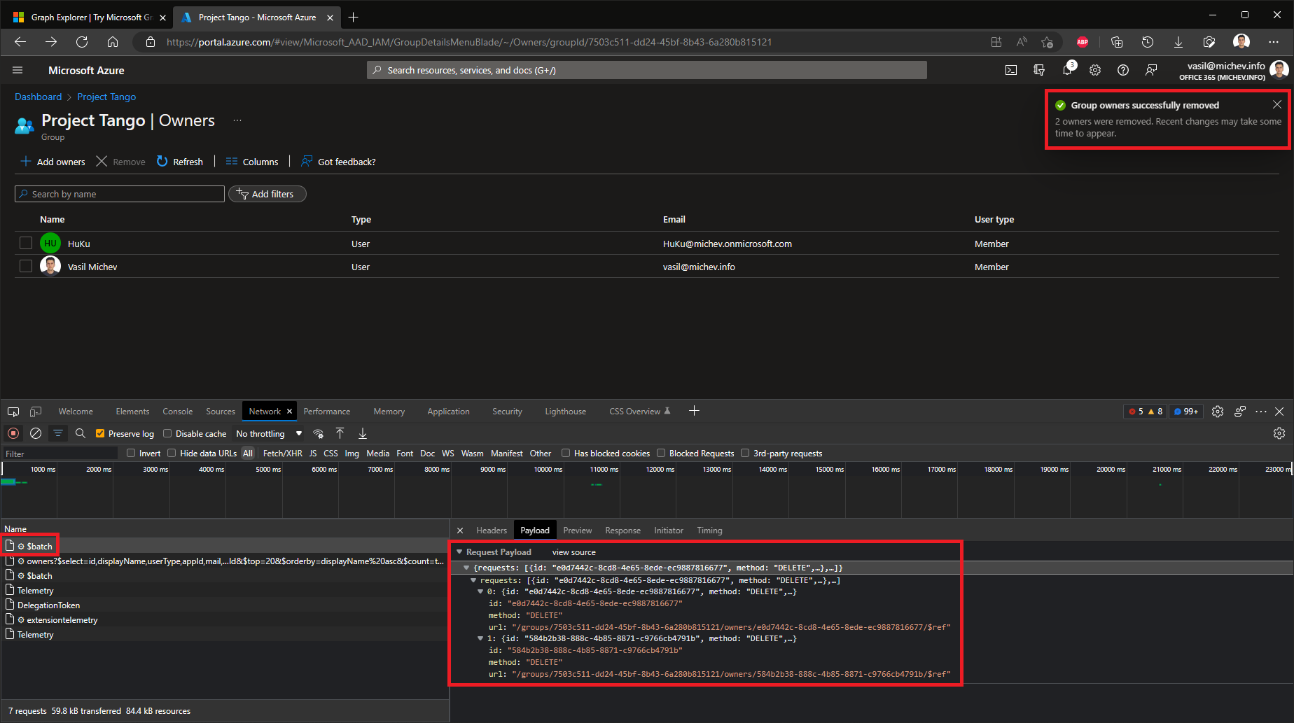 Similarly, the screenshot below corresponds to the same operation performed on another group (so yes, it’s reproducible), and summarizes the important details. You can see the set of two owners, confirmation from the UI that their removal was successful as well as the actual batch requests issued.