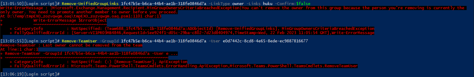 Remove-UnifiedGroupLinks 7503c511-dd24-45bf-8b43-6a280b815121 -LinkType owner -Links vasil,gosho,huku -Confirm:$false Write-ErrorMessage : |Microsoft.Exchange.Management.Recipient.MinGroupOwnersCriteriaBreachedException|You can't remove the owner from this group because the person you're removing is currently the only owner. You need to promote another member to owner before you proceed.