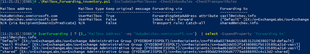 Note that the intention of the script is just to give you a pointer where to look for and surface some basic information, not give you a full-blown solution to discover and manage all forms of forwarding. We’ve tried to use the same formatting for the output of all types of forwarding, allowing you to get information about the object you should look at as well as the recipient to which the messages will be forwarded or redirected to. If you want to export the output to CSV, either use the $varForwarding variable or simply remove the comment mark on the last line of the script.