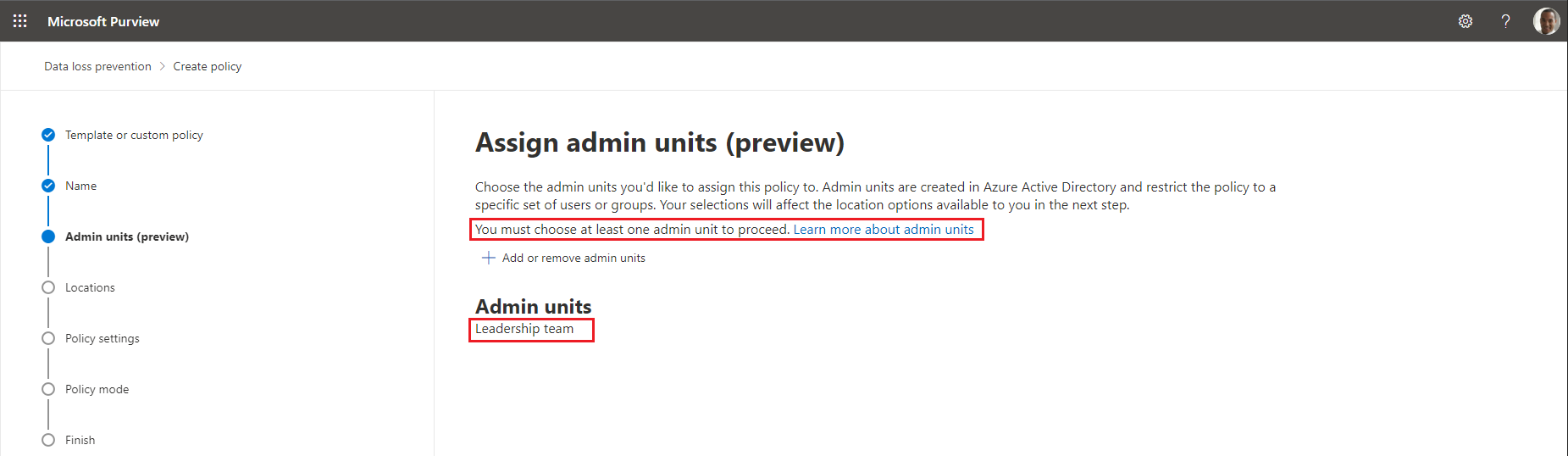 For DLP policies, in order to create a scoped policy, you need to login with an admin user that has at least one AU-scoped assignment. In which case, the list of AUs to select from will be populated, and the text is changed to inform you that you must select an AU, before pressing the Next button.