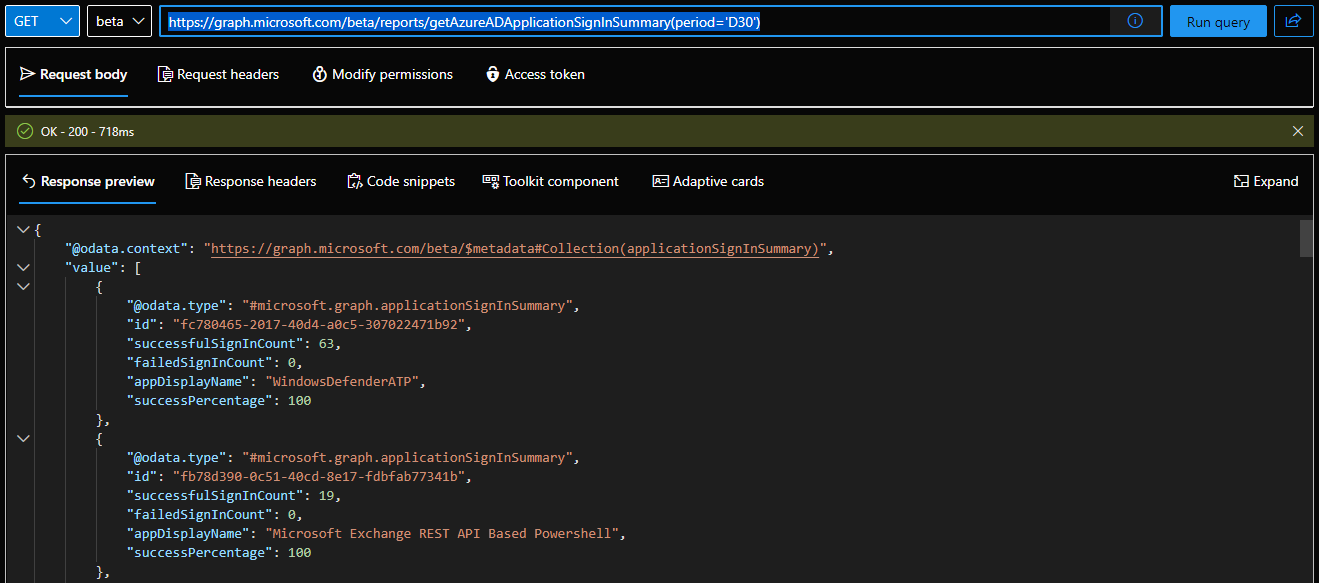 We start with the Application sign-in report, which has been available for a while as mentioned above. The report comes with two “views”: a “summary” one listing all Azure AD integrated applications (including Microsoft’s own apps, tenant app registrations and third-party apps) along with the number of successful and failed logins, as well as “details” view, which includes additional sign-in related details per application object. The “summary” view can be queried via the /reports/getAzureADApplicationSignInSummary endpoint, and exposes a weekly or monthly dataset (“period” should be set to either “D7” or “D30”):