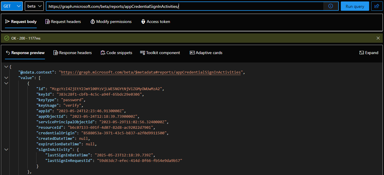 In order to obtain the data for the Application credential activity report, one can issue a GET request against the /reports/appCredentialSignInActivities endpoint. Filtering is also supported, and you can use a filter against specific appId or keyId. Here’s an example via the Graph explorer tool: