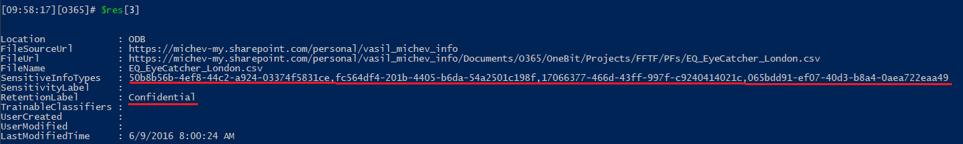Another annoyance is the way the cmdlet handles output. Unlike any other Office 365 cmdlet I’ve worked with, Export-ContentExplorerData returns a set of two different object types within its output. Of those the first one (of type Deserialized.Microsoft.Exchange.Management.LabelAnalytics.ContentExplorer.CmdletOutputDetail) returns the overall information about the query – the complete set of matches (TotalCount), the number of matches returned (RecordsReturned), whether additional pages are available (MorePagesAvailable) and if so, the corresponding “cookie” (PageCookie), to be used to retrieve the next set. If any matches are found, they are dumped within another object (of type Deserialized.Microsoft.Exchange.Management.LabelAnalytics.ContentExplorer.CmdletOutputFileItem). In effect, this makes it a bit more complicated than necessary to work with the results.