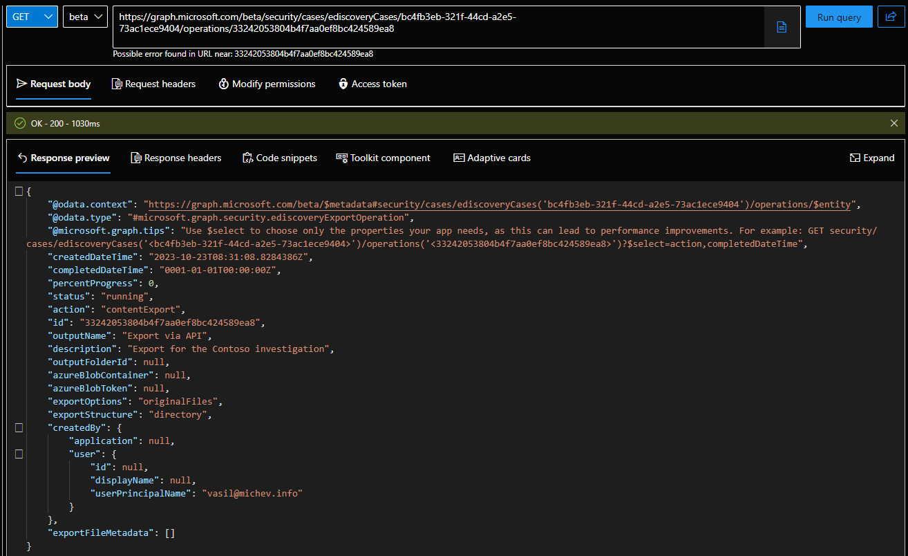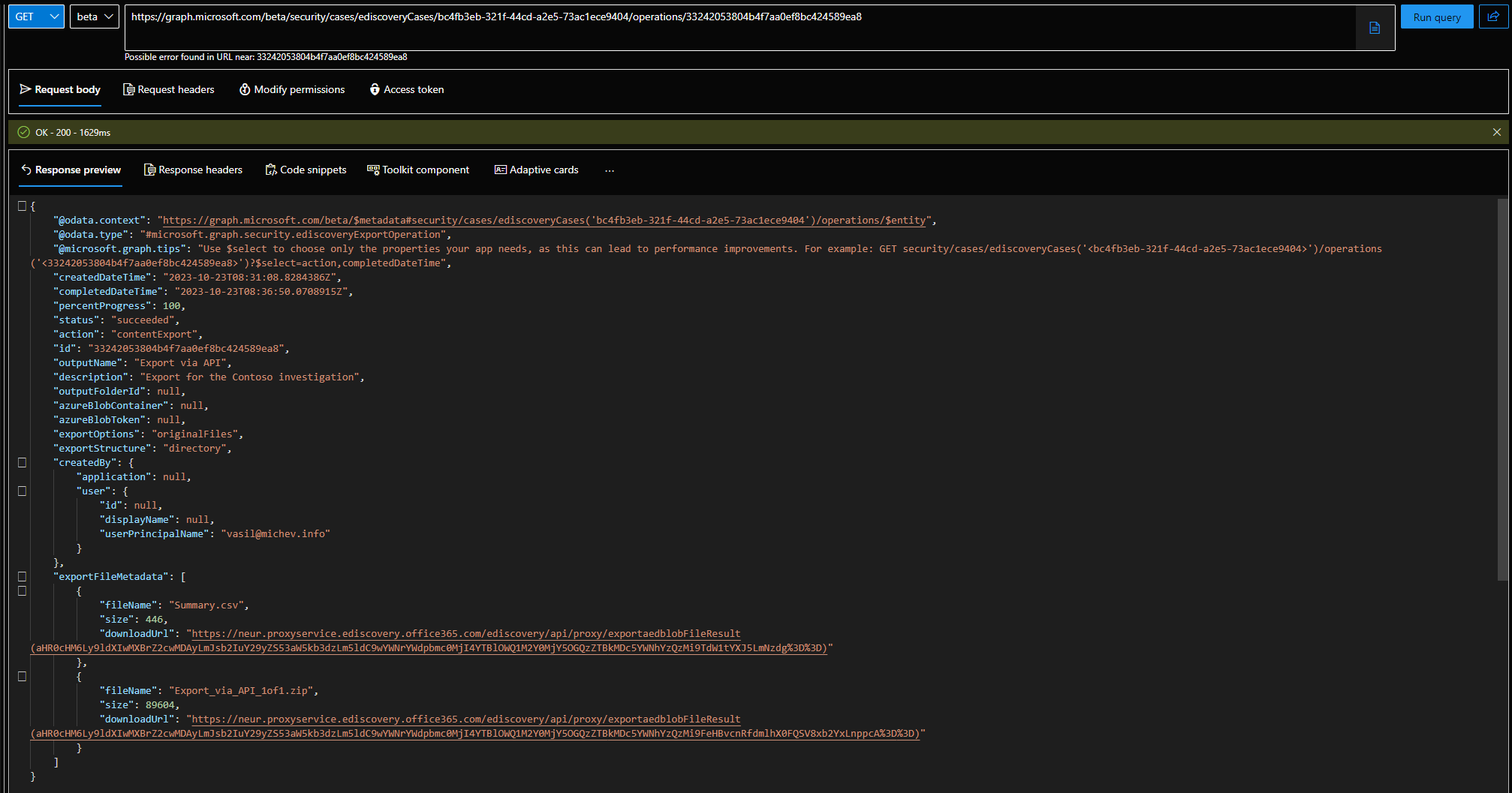With the id at hand, we can fetch details about Export operation and its progress, by issuing a GET request against the /security/cases/ediscoveryCases/{caseId}/operations/{operationId} endpoint. As it might take a while for the operation to complete, expect running few of these – besides all Microsoft’s claims, the process is still quite slow, even when exporting a whooping total of one file. Anyway, the first screenshot below shows the Export operation in progress, whereas the second one reveals the details once the operation is complete.