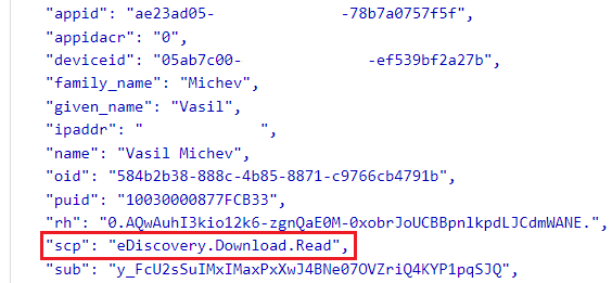 The important thing is to ensure that the token contains the eDiscovery.Download.Read scope, as shown below: