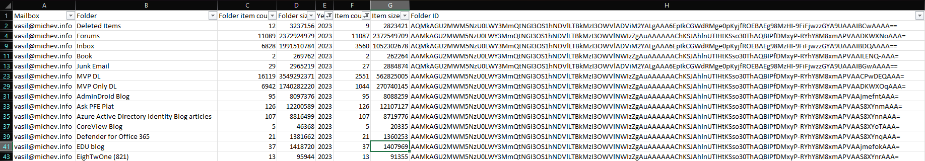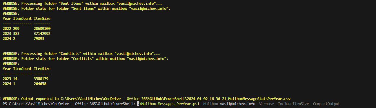 The first screenshot below illustrates the type of output you can expect to see when running the script with the –Verbose parameter. The second one shows how the CSV output file will look like by default. A filter was applied against the “Year” and “Item count” columns, so that only folders containing at least one message from 2023 are displayed. Both examples also leverage the –IncludeItemSize parameter.