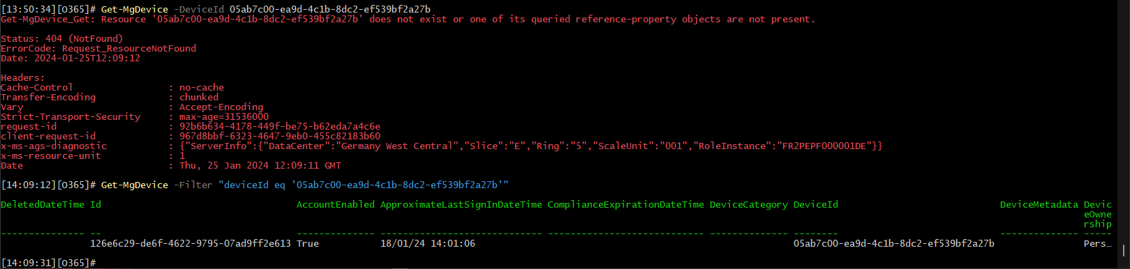 Get-MgDevice -DeviceId 05ab7c00-ea9d-4c1b-8dc2-ef539bf2a27b Get-MgDevice_Get: Resource '05ab7c00-ea9d-4c1b-8dc2-ef539bf2a27b' does not exist or one of its queried reference-property objects are not present. Get-MgDevice -Filter "deviceId eq '05ab7c00-ea9d-4c1b-8dc2-ef539bf2a27b'"