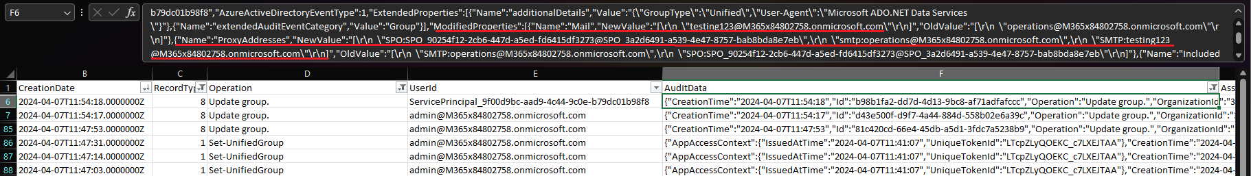 Things got a bit more interesting when repeating the test on a different tenant. The same set of examples were used against a Microsoft 365 Group within the new tenant, the only difference being using the –PrimarySmtpAddress parameter instead of the –EmailAddresses one. As before, only some of the Set-UnifiedGroup executions generated entries within the Exchange Online Admin audit log. The changes to the DisplayName and PrimarySmtpAddress were not visible therein, but did result in events generated within Entra ID Audit log. The combined set of events, as exposed by the Unified audit log is shown on the screenshot below: