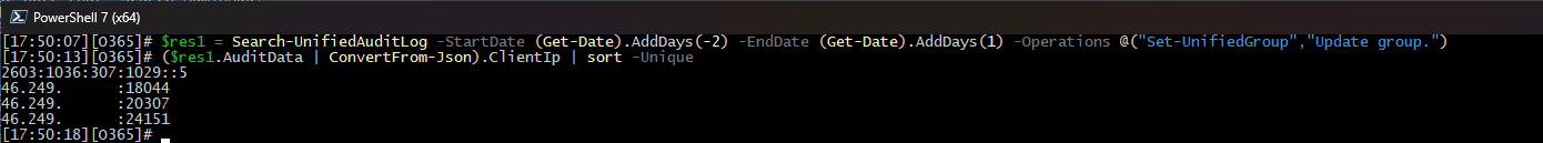 On the other hand, two Update group. events were generated on Entra ID side of things. Interestingly, none of the events were generated in the context of the beloved Microsoft Substrate Management. In this case this is a good thing, as instead said events expose information about the actual user who executed the changes. In turn, said events are exposed within the Unified audit log, along with the events from the Exchange Admin audit log. So overall, we have a good record of the changes, be it a bit more convoluted than one would expect. With one minor detail – no IP information! Instead of the actor’s real IP address, as exposed in the other Set-UnifiedGroup events, we are only given an internal IPv6 address.