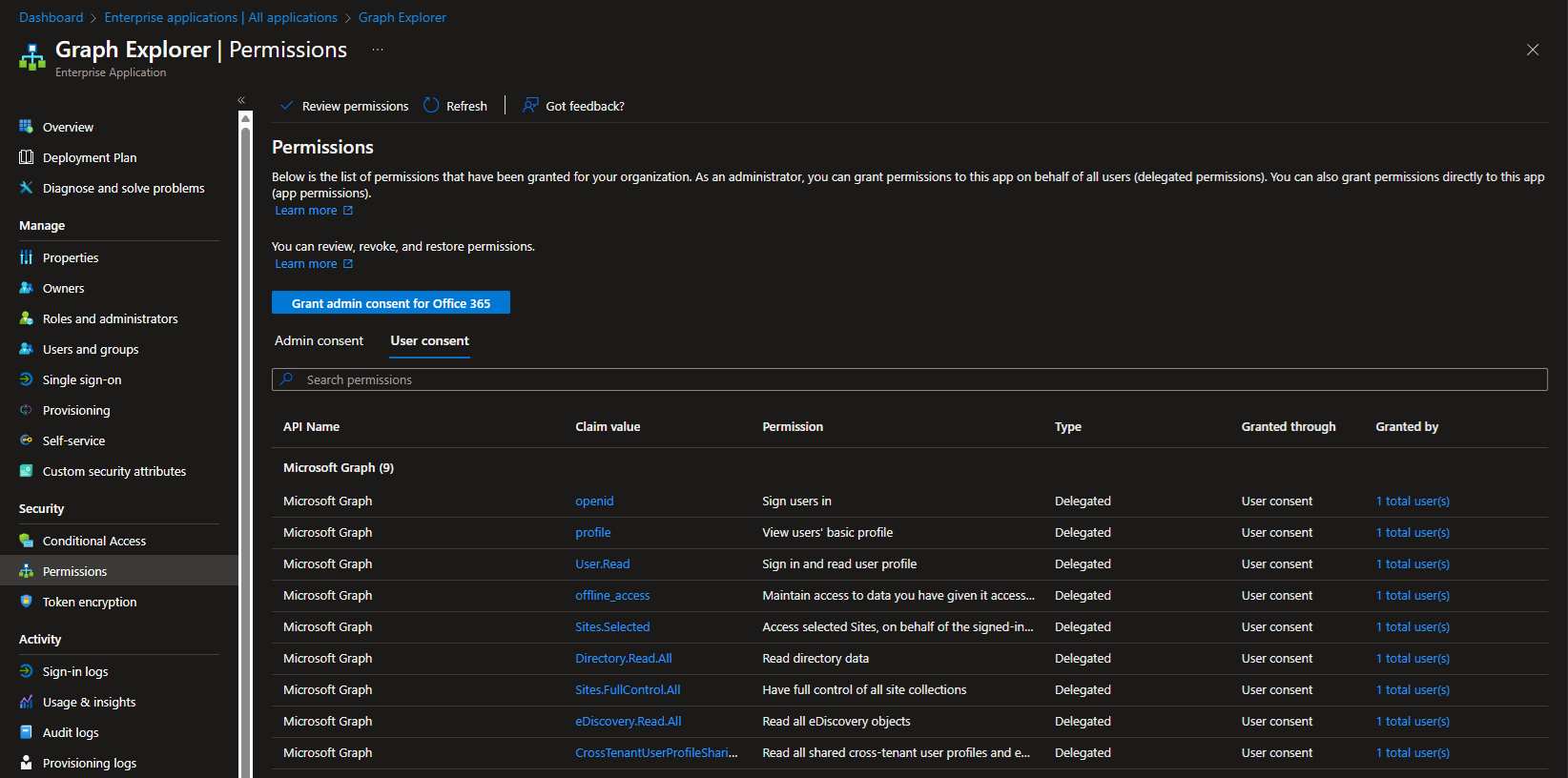 Another important thing to keep in mind when managing permissions is that they are NOT immediately effective. Any existing access tokens for the user must expire first before the changes in permissions are reflected. In the case of the Graph explorer tool and any other app that supports Continuous access evaluation, this can take up to 28 hours! But more on that in another article 🙂