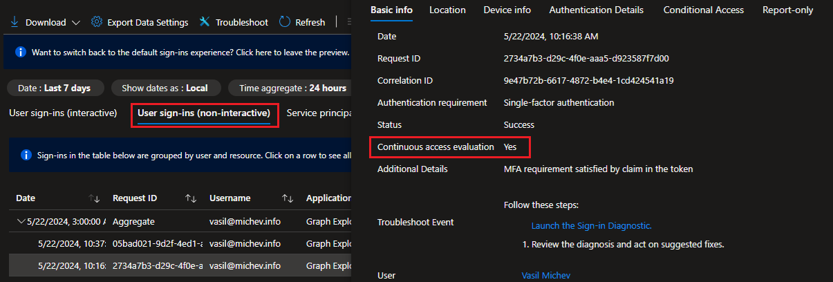 In effect, we’ve shown that every (public) client can request, and receive a “long-lived” CAE-enabled access token, provided the resource in question supports CAE. Which is why I deliberately choose to use the Exchange Online resource. In turn, by replicating the same example for the Graph resource, we get yet another evidence that Graph supports CAE now. What’s interesting though, in the case of manually obtaining CAE-enabled access token for the Graph, no interactive sign-in event was generated at all, and we only got the one non-interactive one. Talk about consistent behavior…
