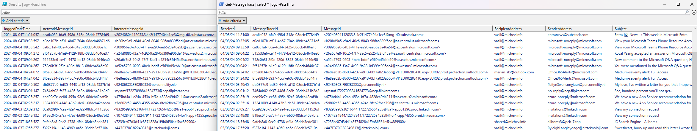 The screenshot below compares message data received from both methods, with message trace output on the right. As you can see, both methods return the same basic “mail flow” data, apart from delay of few seconds in reporting the message’s timestamp, in favor of the message trace method. Interestingly, some other properties do not match in value as well. For example both methods might show different size for the message, and different delivery location.