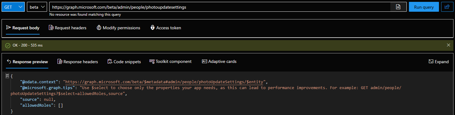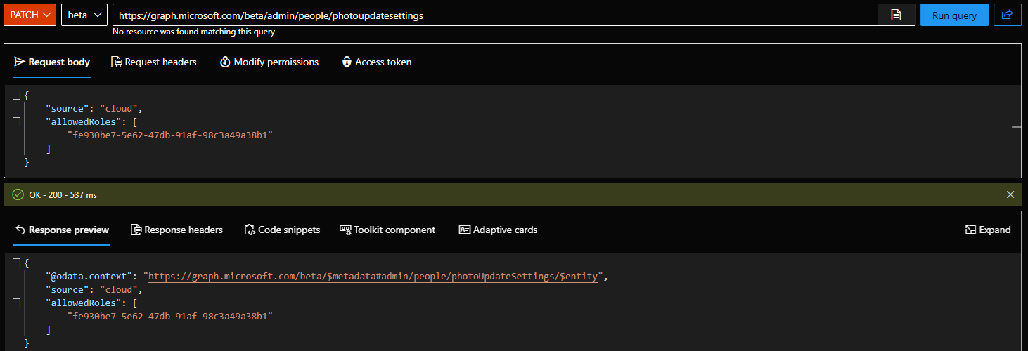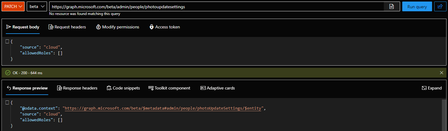 With that information at hand, let’s examine how we can update the photoUpdateSettings control. To do so, one must issue a PATCH request against the /beta/admin/people/photoupdatesettings endpoint. The JSON payload should contain the source property, and optionally the list of allowedRoles. If you omit the latter, every user within the organization will be able to change their photo, once the changes have been replicated (which can take up to 24 hours). The permissions required for making changes to the photoUpdateSettings resource are PeopleSettings.ReadWrite.All. Here is a sample query: