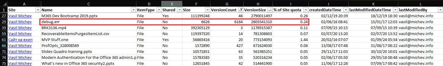 As to why reporting on versions is important, take a look at the following screenshot. We’re looking only at items with two or more versions, sorted by version size. Who would have guessed that a file of 6k size is the second largest storage consumer in my personal OneDrive for Business? Thanks to a whooping 6164 versions, its total storage amounts to over 2.4GB!