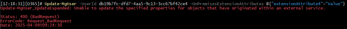 Long story short, if you try to update the value of any of the extensionAttributes1-15 for a (previously) synced user, you end up with the following error message: