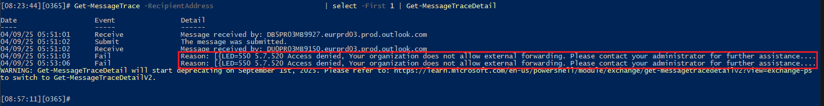 In other words, troubleshooting scenarios where the forwarding rule we configured above does not work as expected for an external recipient is only possible by contacting your IT staff. They will likely be aware of the external forwarding controls put in place, and will let you know whether an exception can be added. If the issue is not clear to them, ask them to check the external forwarding controls and run a message trace to confirm that those are indeed the offender. Below is an example of a message trace details for one such forwarded message blocked by external forwarding controls: