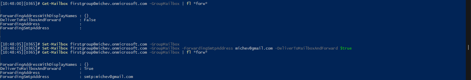 As already mentioned above, Microsoft 365 Group do come with a mailbox, so we can actually configure the regular mailbox-level forwarding settings on them. All you have to do is use the –GroupMailbox switch when issuing the Set-Mailbox cmdlet: