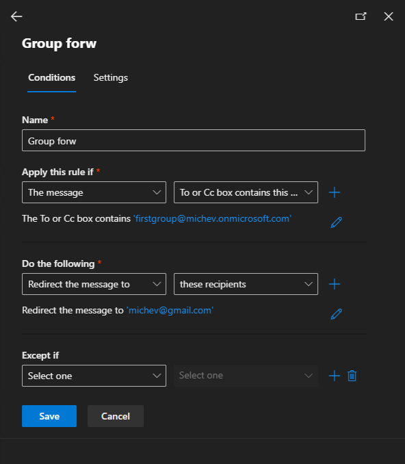 If you want the rule to act on any message addressed to the group, use the Recipient address includes condition and specify the address of the group. To scope the rule to act on specific messages only, use one of the other available conditions. As you have probably noticed by now, a very limited set of conditions is available, so not every scenario will be possible. Lastly, from the Add an action dropdown, select the Forward to entry and enter the address of the intended recipient. If forwarding to internal recipients, you will be able to select the corresponding object from the dropdown menu. For external entries, type in the whole address, then press the Search directory popup, and lastly, the Use this address: one.