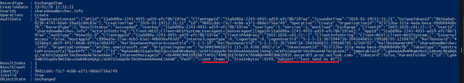 Note the difference between the values in the above example. Therein, MailboxGuid and MailboxOwnerUPN designate the delegate, whereas SendAsUserMailboxGuid and SendAsUserSmtp give us the delegator’s mailbox. If we correlate the values with what we learned above, we know that in the first example the message was “sent using” the delegate mailbox, whereas in the second one, the delegator’s one was used, perhaps in “direct” mode. The SaveToSentItems value is True in both scenarios, telling us that we should be able to find a copy of the sent message within the delegator’s (shared) mailbox. But only the first scenario will result in the copy being present in the delegate’s Sent Items.