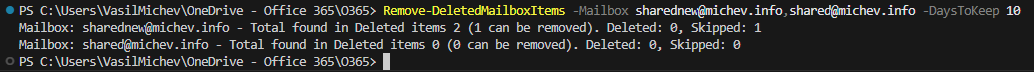 Lastly, we compare the LastModifiedDateTime of any items found in the Deleted items folder against our cutoff, then try the actual deletion. Some basic output is produced in the form of Mailbox name – total items found in the Deleted items with count of items that we can process, count of items skipped and those successfully deleted. The example below shows how to run the function and sample output: