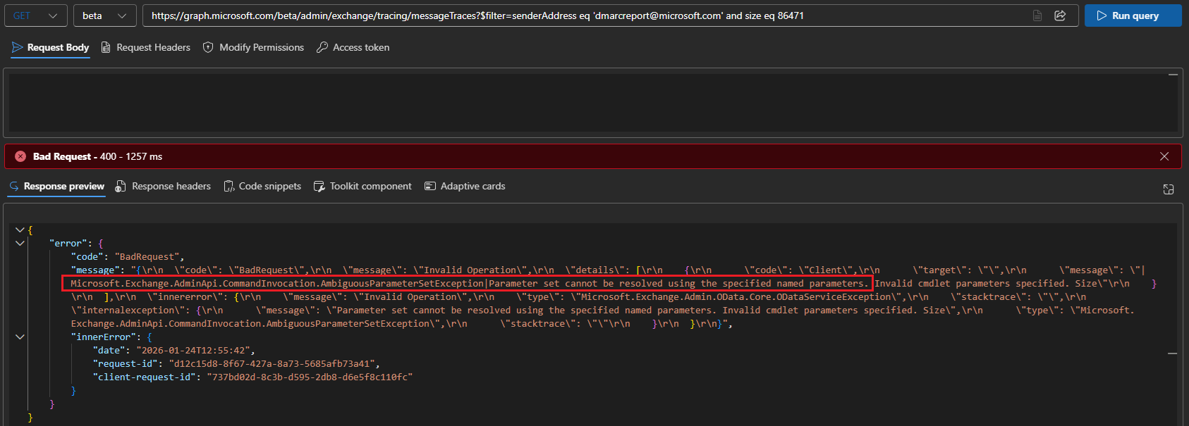 Here’s the fun thing – if you try filter on a non-supported property, say size, you get an intimate look into the implementation of the new endpoint, which turns out to be just a wrapper for Get-MessageTraceV2… surprise surprise!