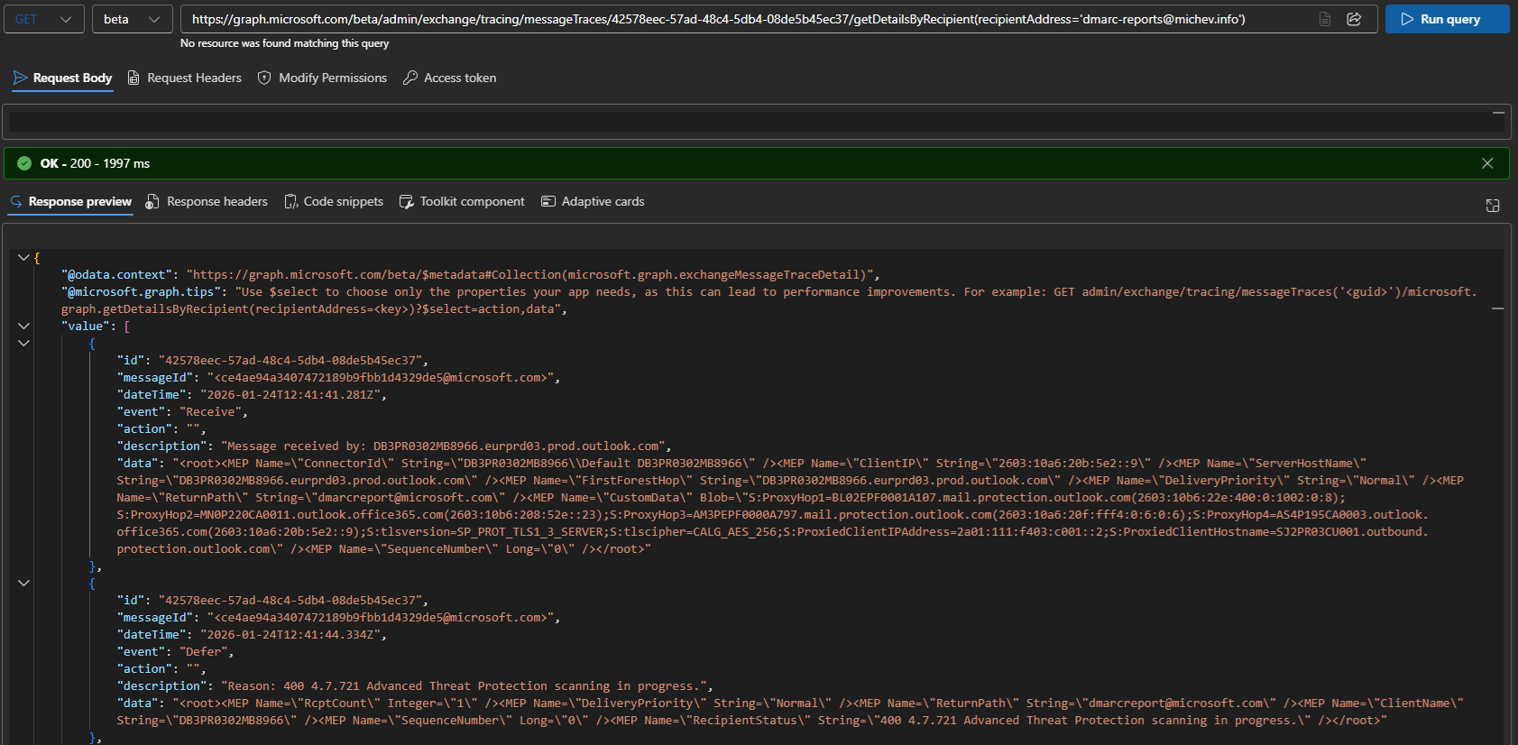 GET https://graph.microsoft.com/beta/admin/exchange/tracing/messageTraces/42578eec-57ad-48c4-5db4-08de5b45ec37/getDetailsByRecipient(recipientAddress='dmarc-reports@michev.info')