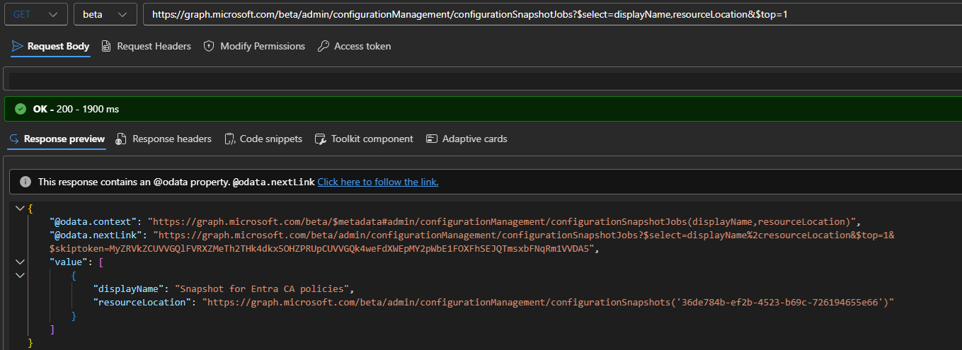 GET https://graph.microsoft.com/beta/admin/configurationManagement/configurationSnapshotJobs?$select=displayName,resourceLocation&$top=1
