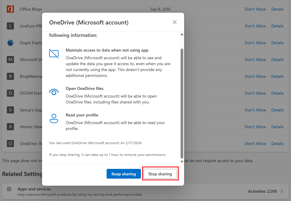 Even when all those precautions in place, I would still recommend that you remove the consent for the application from your Microsoft account page, once you are done with the cleanup. To do so, navigate to Privacy > App access, or use this direct link. Locate the application in the list and click the Details link on the right, then hit the Stop sharing button. If you ever want to run the script again, you will be prompted to re-consent, so no big deal.
