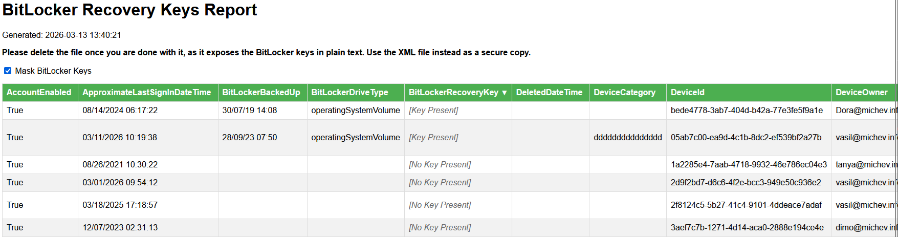 Here is how the HTML report generated based on the same XML file looks like. Note the Mask BitLocker keys checkbox, toggled by default to hide the key values from prying eyes. The second screenshot is the same data with the checkbox toggled off and the key values visible.