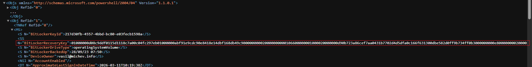 Here are some examples on how the output of the script looks like. We start with the XML file, which always has the keys in their scrambled form. Below is a sample of the “device report” output with the scrambled BitLocker recovery key highlighted, and most of the available attributes trimmed for brevity: