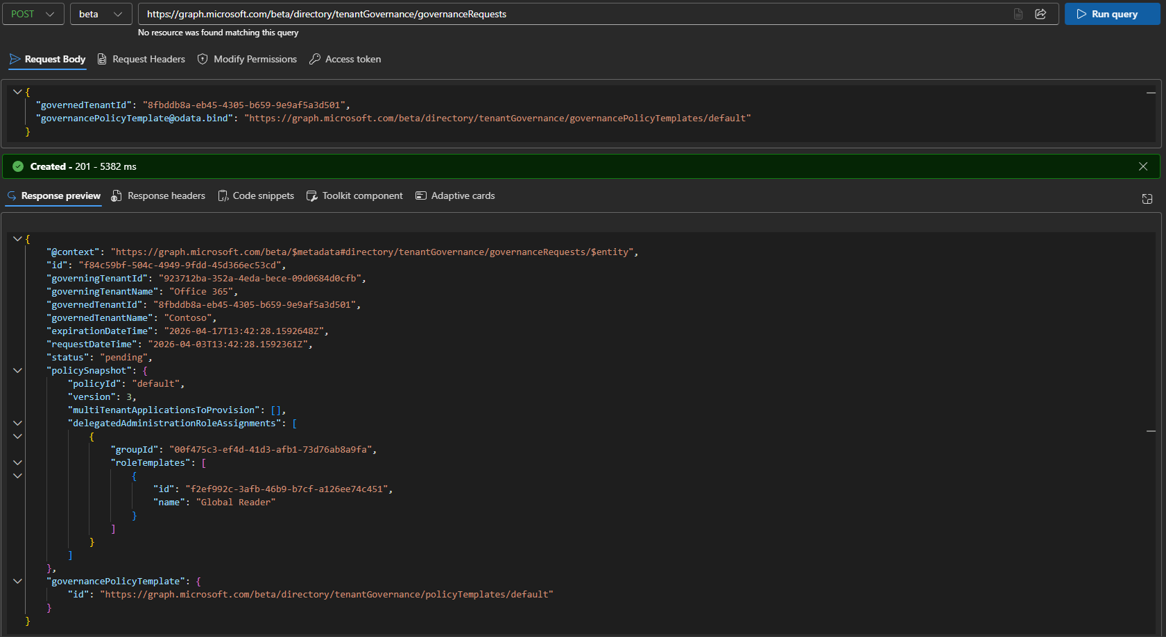 As a note here, there seem to be multiple scenarios when issuing a requests results in a 200 OK response from the server. In my experience, those are all failed requests, and no matching governance request object will be created. Instead, a 201 reply with the governance request object’s properties listed is what a successful execution looks like. Hopefully, the experience gets improved a bit for the GA release.