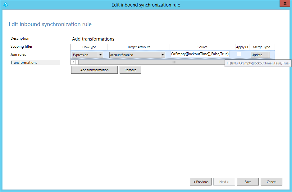Basically, the rule will check the presence of the lockoutTime attribute and will set the accountEnabled Metaverse attribute accordingly – True if the lockoutTime attribute is not present or has a zero value, and False if it does have a value. Here’s how it should look like: