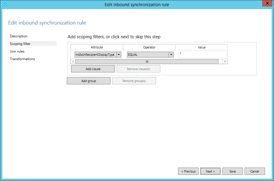 As a second example, consider a situation where you do not want to sync all the available recipients from your on-prem servers to Azure AD. The rule can look at the msExchRecipientTypeDetails or the msExchRecipientDisplayType attributes and filter out the values that match the desired recipient type. For example, if we are to consider regular distribution groups, the value of the msExchRecipientDisplayType we should be looking at is 1. Unlike the previous example, a Scoping filter is a very good idea for such rule, and to create one we need to press the Add group button on the relevant page, then Add Clause. For the Attribute, select msExchRecipientDisplayType. The Operator should be set to Equal, and the Value to 1. Here’s how it would look like: